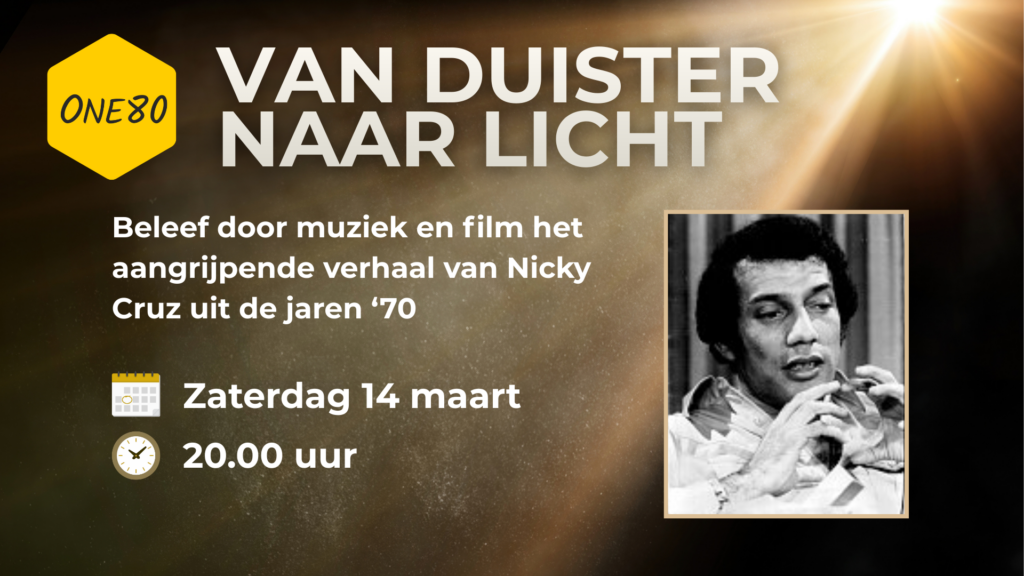 Beleef een inspirerende avond met live muziek en de getuigenis van Nicky Cruz. Een wonderbaarlijk verhaal die laat zien hoe dat Jezus ons brengt van het duister in het licht. Kom want dit wil je niet missen.
